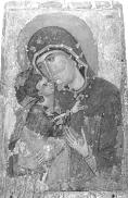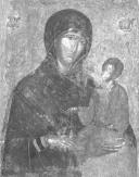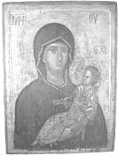 Meisterwerk der Palaiologenzeit. Doppelseitig bemalte Ikone (die später noch in der Waagerechten zwecks neuer Verwendung gekürzt wurde). In den oberen Bildecken die Erzengel Michael und Gabriel. Christus, in ernster gerader Haltung, wendet sich segnend seiner Mutter zu, diese schaut mit ihren wunderbaren braunen Augen voller vorausschauenden Leidens den Gläubigen an. Zärtlich umspielt sie mit ihrer rechten Hand das Knie des Kindes. Die Ausführung der Arbeit ist voller Feinheit und Sensibilität, in sanften Farben und hat eine menschenliebende Ausstrahlung durch die Körperhaltung der Heiligen.