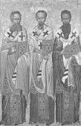 Gregorios, Chrisostomos und Vasilli, ein nicht alltägliches Motiv der byzantinischen Malerei. Diese Ikone wurde später mit einer Ikone aus dem 18. Jhd. selbigen Themas übermalt und erst bei Reinigungsarbeiten an der Ikone entdeckt und freigelegt. Schöne weiche Faltenwürfe der Gewänder und eine gelungene Ausleuchtung der Gesichter. Auf dieser Ikone reicht sich der in der Mitte stehende Chrisostomos in die Komposition ein, ja er steht sogar etwas hinter den anderen beiden, während er in der Ikone aus dem 18. Jhd. in den Vordergrund hervorgehoben wird.