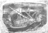 Große Haifische (der Teufel des Meeres, die am Tage des jüngsten Gerichts die Glieder der verschlungenen Opfer herausspeien), in einem dämonischem Meer, ein Mönch sitzt im Schiff. Dabei kümmert sich der Künstler nicht um die tatsächlichen Größenverhältnisse.