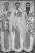Diese Ikone, auf ein anderes Holz übertragen, deckte eine Ikone aus dem 14. Jhd. mit dem gleichen Thema ab. Die drei Bischöfe Gregoris, Chrisostomos und Vasilli sind mit ihren typischen byzantinischen Merkmalen (Schulterschal, untere Schärpe und Kniekissen) dargestellt. Die Figuren füllen den Rahmen mit ihren eng beieinanderstehenden Körpern bis zum Bildrand aus, jener ist geschmückt mit silbernen Blüten auf dunklem Grund und die Heiligenscheine haben kleine Kreise an ihren Rändern. Solche Merkmale weisen auf makedonische Stilmittel des 18. Jhd. hin. Genaue, luftig-leichte Faltenwürfe und sanfte Farben deuten ebenfalls auf eine Zeichenwerkstatt in Thessaloniki hin.