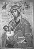 Ehemals auf eine alte Ikone des 12. Jhd. gemalt, von dieser abgenommen und auf ein neues Holz übertragen worden. An das byzantinische Vorbild anknüpfend, ist diese Darstellung seitenverkehrt zur ersten. Allerdings fehlt dieser Ikone der bestrürzte Gesichtausdruck Marias. Abweichend von den byzantinischen Vorbildern ist jedoch die viel lebendigere Beinhaltung Christi, Marias halbverdeckte rechte Hand die ihn trägt und die Schriftrolle, die jetzt geöffnet ist. Diese Komposition hält sich jedoch nicht an die sonst zeitgenössisch vorherrschende Richtung. Im Gegensatz zur Komnenischen Zeit benutzte der Maler verschwenderisch viel Gold mit den dichtgestellten Griffelstichen, die der Kleidung den Glanz verleihen. Ästhetisch wunderbar die arabeskenhaft gestaltete Haube der Maria. Die antiklassische Gestaltung der Gesichter sowie die Heiligenscheine läßt auf eine Werkstatt in Thessaloniki schließen.