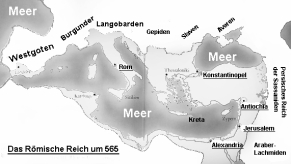 Das seit 67 n. Chr. bestehende römische Reich, an seinem Ende von Theoderich dem Großen (geb 347, regiert von 379-395) regiert, muß unter seinen Söhnen aufgeteilt werden. Arcadius bekommt das griechisch sprechende ost-römische Reich und sein Bruder Honorius erhält das lateinisch dominante west-römische Reich als Erbe zugesprochen.
